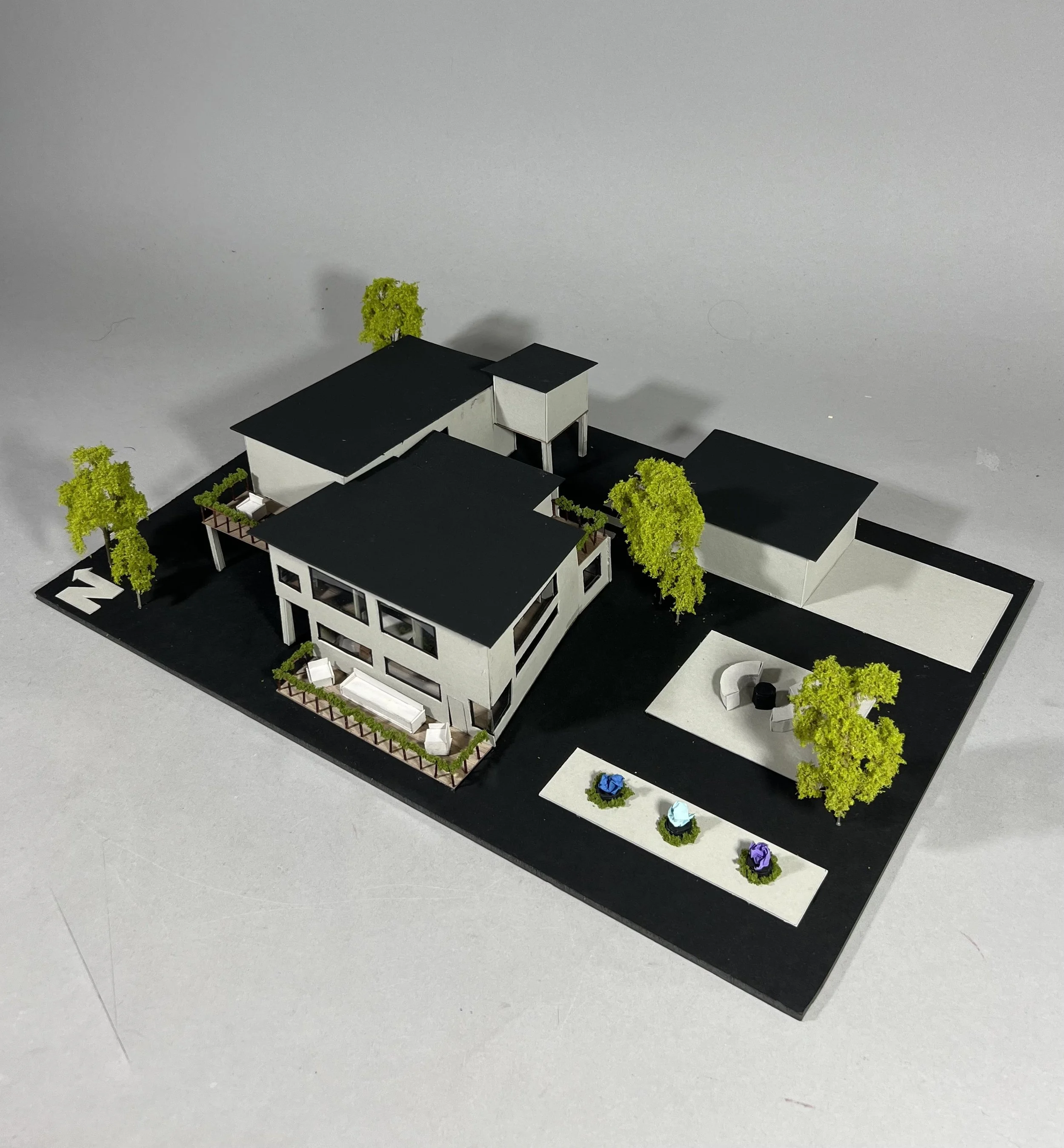 Original design of an eco-residence responding to an assigned program of a 2-story, 5000 square foot space on Yerba Buena Island. Designed with recyclable and environmentally friendly materials and alternative energy, water, and waste solutions. Final model made of foam core board, 2-ply archival board, acetate, balsa wood, and greenery 1/8” = 1’ scale. Fall 2023.
